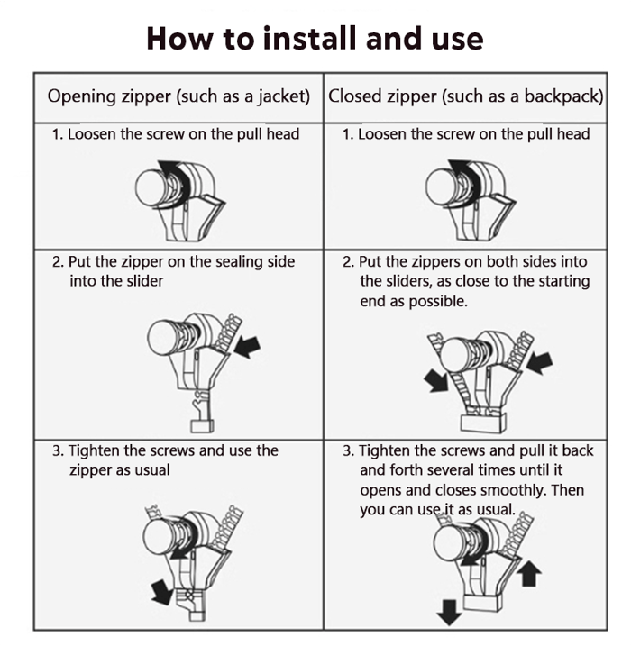 • Perbaiki ritsleting patah seketika tanpa perlu alat tambahan atau jasa jahit.